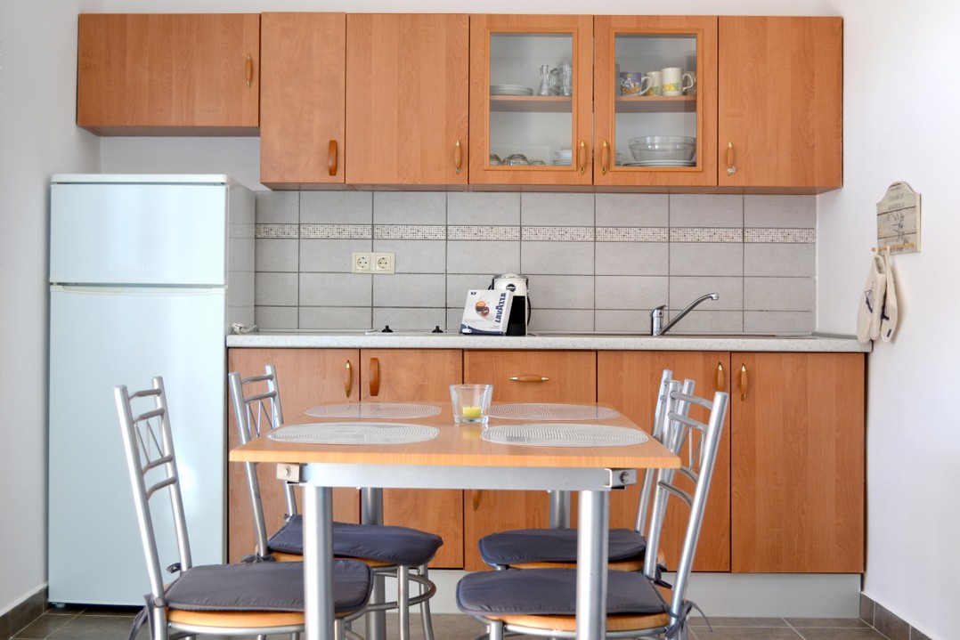 Die Ferienwohnung im Obergeschoss (ca. 70 m²) bietet Platz für 4 Personen. Sie ist modern und hochwertig eingerichtet und verfügt über eine Klimaanlage. Auf dem gemütlichen Balkon kann man laue Sommerabende genießen. Es gibt Zugang zu einem gepflegten Garten mit mediterranen Pflanzen und einem Grill. WLAN ist kostenlos verfügbar.